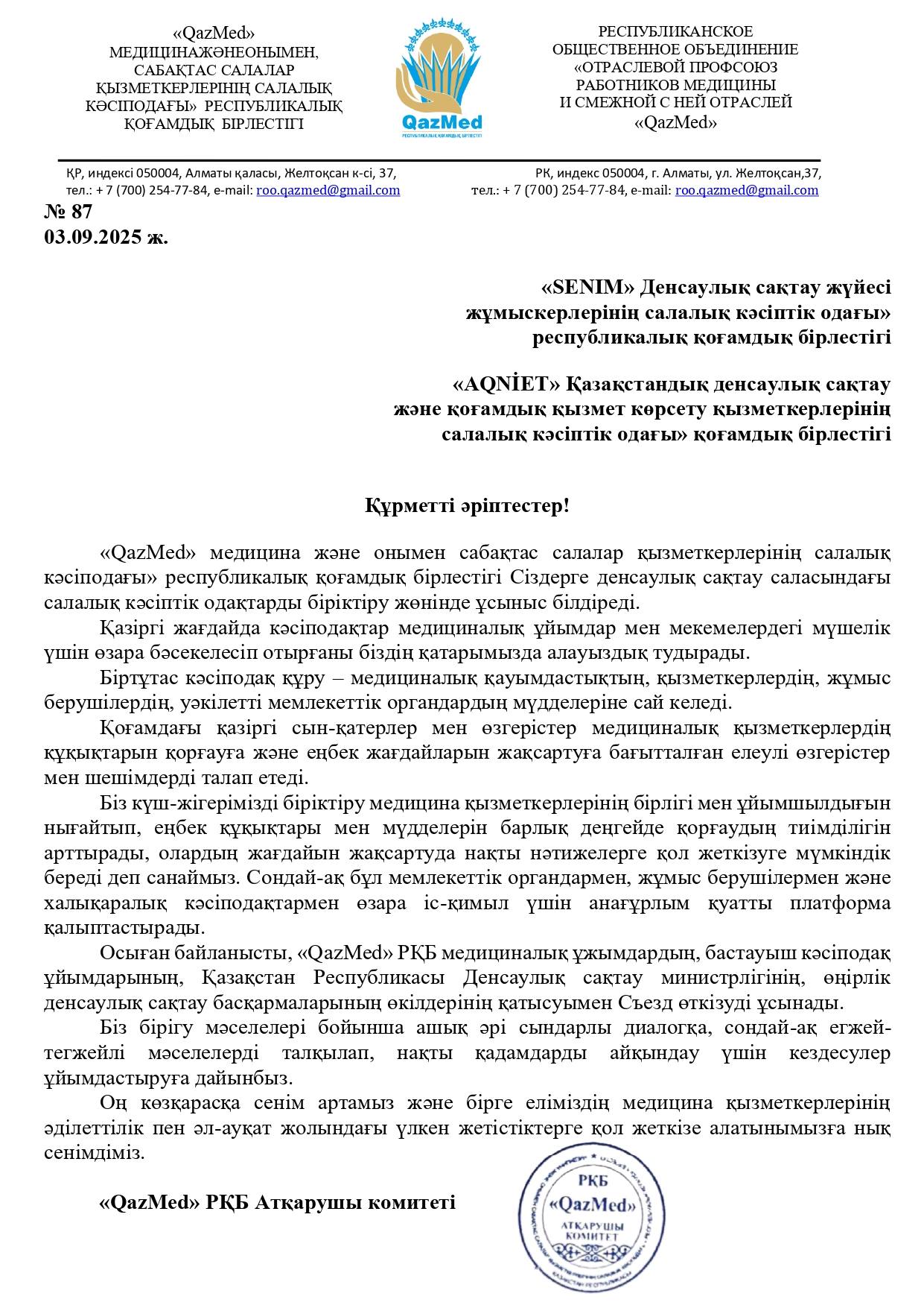 «QazMed» РҚБ Атқарушы комитетінің Денсаулық сақтау саласындағы салалық кәсіподақтарға бірігу туралы ұсыныспен жүгінуі