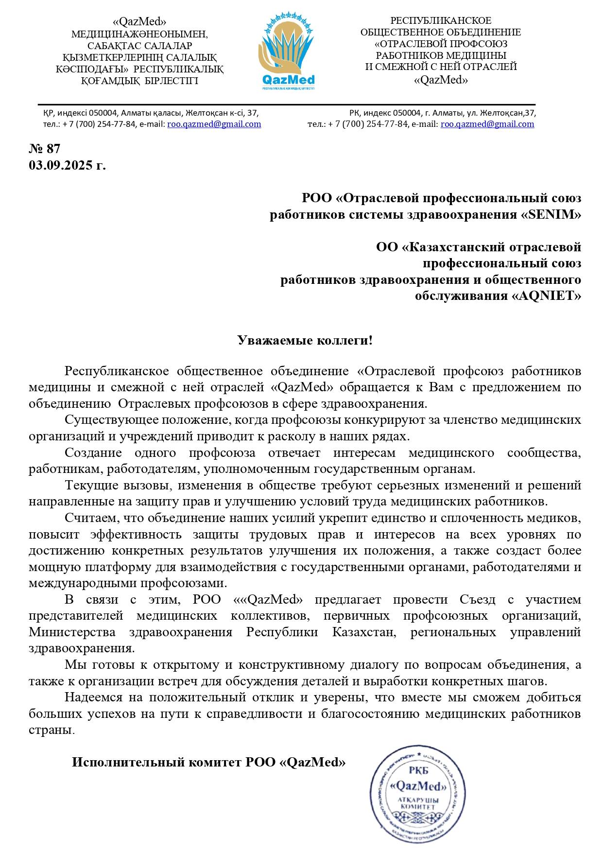 Обращение Исполнительного комитета РОО «QazMed» к Отраслевым профсоюзам в сфере здравоохранения с предложением об объединении